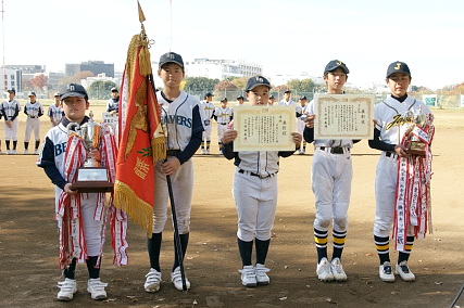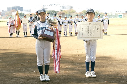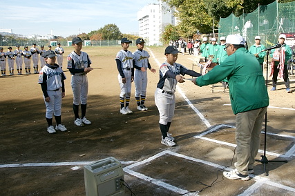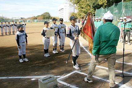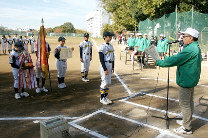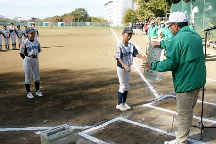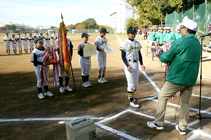 第95回秋季大会の表彰式・閉会式が 和光市レク広場で行われました。 最初は埼玉南部少年野球連盟表彰です。 優勝の賞状が栗原ビーバーズに贈られました。 |